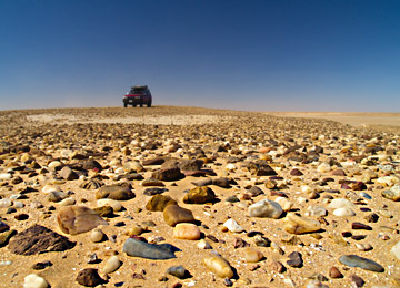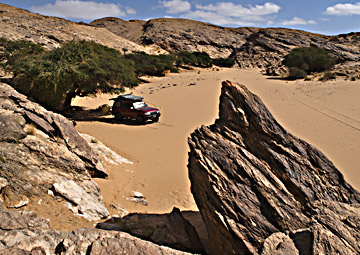 Setting forth, we descend from a stony plain and enter into a vast depression, filled with light sand that won’t support the weight of the vehicle very well. The track dissolves and we are soon completely on our own, trying to negotiate a passage to the hills that are protruding on the eastern horizon. It takes us two bold hours to cover these fifteen kilometers. Our tires are deflated for soft sand driving, all three differentials are locked (thanks to Toyota for equipping our HDJ80 with reliable factory lockers on both axles) and still there is a lot of struggle when the going is too soft to remain optimistic about our chances of reaching the other side.