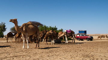 We cross a flat, stony hamada during the first fifty or so kilometers. Outcrops of grass are definitely not abundant but they evidently offer enough food for numerous herds of camels—interesting animals, unbelievably well adapted to the harshness of life in the desert. Poetically called the “ships of the desert,” camels were the means of transport that not only facilitated the trans-Saharan trade but made it possible in the first place. Although the camels in the Central Sahara today perform “beast-of-burden” tasks similar to those for which they were introduced to the Sahara around two thousand years ago, here they are mainly raised as a source of staple meat for the locals.