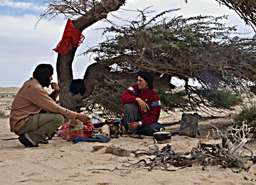 Shepherds preparing lunch—the curved trunk of an acacia tree tells of strong unidirectional winds that sweep across this part of the Sahara.