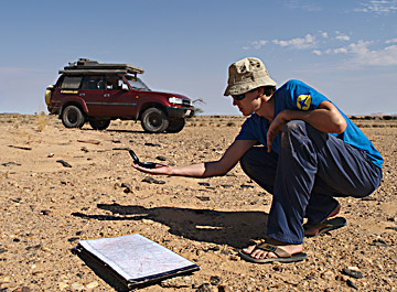So we arrive and after three days on a ferry crossing the Mediterranean, two full days of driving south through Morocco and then another two days of dicey driving deeper and deeper into an unknown desert, we are here. Where exactly? The screen of the GPS plotter is empty apart from the information on longitude and latitude, as there are no reasonably detailed GPS maps for the Western Sahara available for general use. The printed maps we have are old Russian topographic charts and while they prove themselves quite usable as far as important landmarks are concerned, they are painfully outdated regarding the wells, settlements and pistes that connect various parts of this country. Where exactly are we? And what bearing should we take?