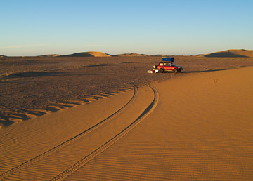 These salty desert plains have an ominously treacherous name in the Arabic language: sebha. It is evident from the very way this word sounds—primeval and rough—that crossing a sebha is a serious thing. Thus we feel a deep relief when, approaching the other side, the ground finally becomes firmer and the going easier. But there is no time to celebrate a successful crossing. Another obstacle is rising before us, fueling our anxieties. We reach the hills that we first spotted from the other side of sebha and now we see that these are no hills in the usual meaning of the term—these are sand dunes.