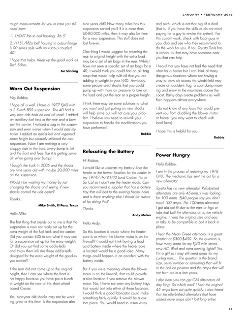 Hello Robbie, I am in the process of restoring my 1978 FJ40. The mechanic has sent me out for a new alternator. Toyota has no new alternator. Refurbished alternators are only 45-amp. I was looking for 100 amps. FJ40 people say you don't need 100 amps. The 100-amp alternator I got did not fit due to the ears or legs or tabs that bolt the alternator on to the vehicle engine. I need the original size and ears or tabs to be compatible to bolt it back in place. I hear the Mean Green alternator is a great product at $300-$400. So the question is, how many amps for my FJ40 with stereo, new AC, iPod and extra running lights? Yes, I’m a girl so I may still need amps for my curling iron…. The question is the brand, size, serial number or something that will fit in the bolt on position and the amps that will not burn out in a few years. I also hear you can get GM alternators all day long. So which one? I hear the original 45 amps burn out quite quickly. I also heard that the refurbished alternators that have added more amps don’t last long either.