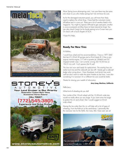 Hi Robbie, I would love wheel and tire recommendations. I have a 1971 FJ40 that has 2-1/2-inch lift springs and a 2-inch body lift. It has a very torquey marine engine, 5.7 with a quadra jet, SM465 and TLC 3-speed transfer case. I am currently running 35/10.50 tires on 10x15 rims with 1-inch spacers that fit well. The tires are worn and ready for replacement. The existing tires are really truck tires and the sidewalls are too stiff. I barely get a sidewall bulge when airing down. I hear Goodyear mud terrain tires work well but don't want to make the same mistake as last time. I was also wondering if a narrower rim or different tire size would be better. Thanks for sharing your wealth of information.