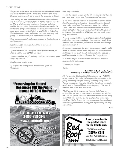 The problem is that almost no air even reaches the rubber rectangular sleeve duct that attaches to the heater core inside the cab. None blows out onto the driver's feet or up onto the windshield to defrost. Since nothing has been altered since the summer when the heater and defrost worked, my assumption was that the problem was with the RPM at which the motor was turning. I removed and disassembled the motor. I had the commutator lathed professionally. The brushes and springs were inspected and pronounced functional with good spring pressure and still plenty of graphite life in the brushes. The brushes were scraped and evened out to remove scoring and pitting. The entire assembly was cleaned and lubricated. These measures created no change whatsoever in the effectiveness of the blower motor. I see four possible solutions but would like to know what you recommend. 1) From someplace like Cruiserparts.net or Spector Off-Road, purchase a working used OEM blower motor. 2) From someplace like J.C. Whitney, purchase a replacement generic new blower motor. 3) Refurbish the existing motor. 4) Swap out the existing unit for an aftermarket system like Vintage Air.