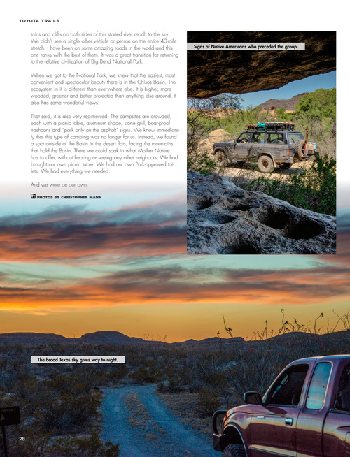 tains and cliffs on both sides of this storied river reach to the sky. We didn’t see a single other vehicle or person on the entire 40-mile stretch. I have been on some amazing roads in the world and this one ranks with the best of them. It was a great transition for returning to the relative civilization of Big Bend National Park. When we got to the National Park, we knew that the easiest, most convenient and spectacular beauty there is in the Chisos Basin. The ecosystem in it is different than everywhere else. It is higher, more wooded, greener and better protected than anything else around. It also has some wonderful views. That said, it is also very regimented. The campsites are crowded, each with a picnic table, aluminum shade, stone grill, bear-proof trashcans and “park only on the asphalt” signs. We knew immediately that this type of camping was no longer for us. Instead, we found a spot outside of the Basin in the desert flats, facing the mountains that hold the Basin. There we could soak in what Mother Nature has to offer, without hearing or seeing any other neighbors. We had brought our own picnic table. We had our own Park-approved toilets. We had everything we needed. And we were on our own.