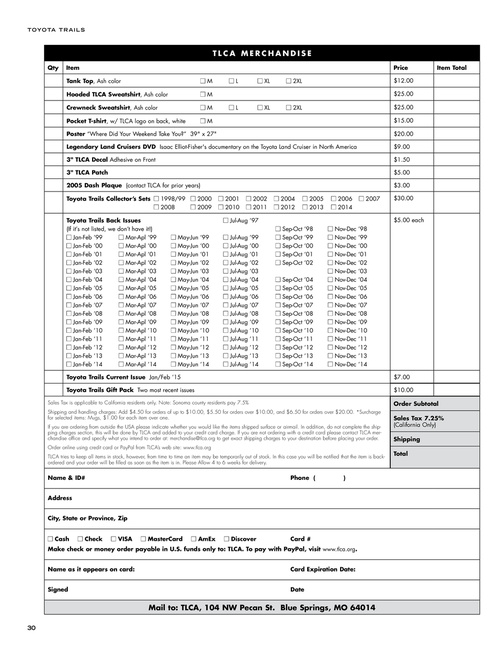 Poster “Where Did Your Weekend Take You?” 39" x 27" Legendary Land Cruisers DVD Isaac Elliot-Fisher's documentary on the Toyota Land Cruiser in North America 3" TLCA Decal Adhesive on Front 3" TLCA Patch 2005 Dash Plaque (contact TLCA for prior years) Toyota Trails Collector’s Sets n 1998/99 n 2000 n 2008 n 2009 Toyota Trails Back Issues (If it’s not listed, we don’t have it!) n Jan-Feb ’99 n Mar-Apl ’99 n Jan-Feb ’00 n Mar-Apl ’00 n Jan-Feb ’01 n Mar-Apl ’01 n Jan-Feb ’02 n Mar-Apl ’02 n Jan-Feb ’03 n Mar-Apl ’03 n Jan-Feb ’04 n Mar-Apl ’04 n Jan-Feb ’05 n Mar-Apl ’05 n Jan-Feb ’06 n Mar-Apl ’06 n Jan-Feb ’07 n Mar-Apl ’07 n Jan-Feb ’08 n Mar-Apl ’08 n Jan-Feb ’09 n Mar-Apl ’09 n Jan-Feb ’10 n Mar-Apl ’10 n Jan-Feb ’11 n Mar-Apl ’11 n Jan-Feb ’12 n Mar-Apl ’12 n Jan-Feb ’13 n Mar-Apl ’13 n Jan-Feb ’14 n Mar-Apl ’14