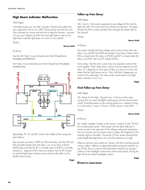 Hello Roger, I stumbled across your site after I bought a harness from eBay that was supposed to be for my 1987 Toyota pickup and did not work. They refunded my money and told me to keep the harness. I rewired it as per your diagram and the low and high beams work but my high beam indicator light does not come on. Any ideas? Thanks.