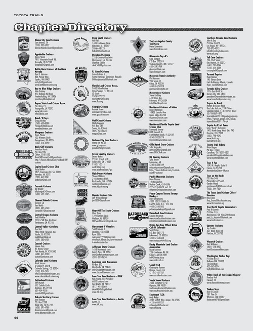 Alamo City Land Cruisers San Antonio, TX (210) 393-5922 alamocitylandcruisers@gmail.com Appalachia Cruisers Rance Sharp 7917 Mountain Brook Rd. Knoxville, TN 37938 sharpfzj80@gmail.com Battle Born Cruisers of Northern Nevada Dan R. Johnson 806 Packer Way Sparks, NV 89431 rusty.tlc@gmail.com www.battleborncrusiers.org Bay to Blue Ridge Cruisers John Embrey 873 Kellogg Mill Road Fredericksburg, VA 22406 jmembrey@adelphia.net Bayou State Land Cruiser Assoc. P.O. Box 271 Youngsville, LA 70592 www.bslca.com info@bslca.com Beach ’N Toys Gregg McNab (760) 630-8088 72zippyfj40@cox.net wwwbeachntoys.com Bluegrass Cruisers Thom Placier 123 Winners Circle Georgetown, KY 40324 (502) 316-3590 Book Cliff Cruisers Jonathan Harris P.O. Box 985 Clifton, CO 81520 BookCliffCruiserClub@gmail.com http://forum.ih8mud.com/co-book-cliffcruisers Capital Land Cruiser Club Tracy Barker 2875 Towerview Rd. Ste 1000 Herndon, VA 20171 (703) 467-9341 cptbarker@aol.com Cascade Cruisers Bill Wright billybongo63@msn.com (503) 539-1705 Channel Islands Cruisers Oxnard, CA Ken Welch (805) 485-5740 kenwelch1@verizon.net Central Oregon Cruisers Todd Winkler 17165 SW Blue Jay Road Terrebonne, OR 97760 Central Valley Crawlers Dan Hull 9860 West Ferguson Ave. Visalia, CA 93291 hulld@earthlink.net (559) 280-6105 Coastal Cruisers Steven Tetu 81 Moray Street Port Moody, BC V2H 3M2 (604) 461-3540 cruiser@uniserve.com Colorado Land Cruisers Mark Janzen 6 Studio Pl. Unit B Colorado Springs, CO 80904 (719) 473-7257 info@coloradolandcruisers.org www.coloradolandcruisers.org CottonLand Cruisers Jeff Murrah 512 Carlisle Circle Madison, MS 39110 601-954-9558 murrah40@gmail.com Dakota Territory Cruisers Ann Thorson P.O. Box 2238 Rapid City, SD 57709 (605) 391-4788 dakotacruisers@gmail.com www.dakotacruisers.com Deep South Cruisers Hal Hall 1445 Caribbean Circle Alabaster, AL 35007 205-664-8723 halhall@bellsouth.net DixieLand Cruisers 2215 Country Club Drive Montgomery, AL 36106 Clarence Specht clank506@yahoo.com FJ Island Cruisers Josue Estrada G. Santo Domingo, Dominican Republic 08ttbrujablanca@hotmail.com Florida Land Cruiser Assoc. 9680 N Enellia Ave Citrus Springs FL 34433 JD Dixon 352-637-5399 newsletter@flca.org www.flca.org Georgia Cruisers Andrew Howe amhowe1@yahoo.com www.gacruisers.com Gold Coast Cruisers Wally Boggess P.O. Box 681 Somis, CA 93066 (805) 523-7628 mpguy@aol.com Gotham City Land Cruisers Metro NY, NJ, CT www.gclcny.com president@gclcny.com Green Country Cruisers Deano Kothe 9915 E 136th St N Collinsville, OK 74021 918-371-3511 ourtlc@aol.com www.okoffroad.com/gcc High Desert Cruisers Shawn Williams 210 Montana Wells Rio Rancho, NM 87124 swilliams@bernco.gov www.hdcruisers.org Hoosier Cruiser Club Jeff Weissenberger jtw2308@gmail.com The Los Angeles County Trail Crew Daniel Liverman www.thetrailcrew.com Minnesota Toyx4’s Greg Kemper P O Box 270574 Vadnais Heights, MN 55127 651-429-3989 gkemper@aol.com www.mntoyx4.com Mountain Transit Authority Phil Johnson 905 Susan Ct. Gilroy, CA 95020 (408) 847-7828 pjohnson@netgate.net Mountaineer Cruisers Steve Lindsley 611 Oliver Ave. Fairmont, WV 26554 info@lindsleyart.com Northwest Cruisers of Idaho Brian Thompson 10438 Lancelot Ave Boise, Idaho 83704 thusimos@excite.com www.nwcruisers.com Northwest Florida Toyota Land Cruiser Club Raymond Towner 803 Kenneth Dr. Fort Walton Beach, FL 32547 (850) 902-0774 RaymondTowner@aol.com Olde North State Cruisers John Vargosko johnveeONSC@gmail.com www.ONSC4x4.com Oil Country Cruisers Tyler Arnott Edmonton, AB (780) 838-8189 oilcountrycruisers@gmail.com http://forum.ih8mud.com/ca-ab-oilcountry-cruisers/ Pacific Mountain Cruisers Dave Thomas 12 Margaret Dr. Walnut Creek, CA 94596 (925) 945-0870, ext. 12 dthomas@tiogaconstruction.com Peace Canyon Toyota Swamp Donkeys Deny Chramosta #207 10139 100th St. Fort St. John, B.C. V1J 3Y6 (403) 354-5505 pctswampdonkeys@gmail.com Razorback Land Cruisers Serving Arkansas www.razorbacklandcruisers.com info@razorbacklandcruisers.com Rising Sun Four Wheel Drive Club of Colorado Scott Yoder P.O. Box 260175 Lakewood, CO 80226 (303) 246-6608 www.risingsun4x4club.org Rocky Mountain Land Cruiser Association Bruce Loewen 225 Covehaven Rd. NE Calgary, AB T3K 5W7 info@rmlca.ab.ca www.rmlca.ab.ca SoCal TLCA Christopher Farmer Orange County, CA (714) 745-1187 www.socallandcruisers.com South Sound Cruisers 2603 Kempton St. SE Olympia, WA 98501 southsoundcruisers@yahoo.com www.southsoundcruisers.org Southeast TLCA Andy Ridge 3285 Griffith Way, Jasper, TN 37347 (423) 605-7831 radioridge@charter.net www.stlca.org Southern Nevada Land Cruisers John A Day P O Box 26872 Las Vegas, NV 89126 702-873-4013 john@casaday-hollow.com www.snlc.org Tall Corn Cruisers 726 53rd Street Des Moines, IA 50312 (641) 791-8044 (515) 314-3255 cmcampbell@gmail.com Tarsand Toyotas Ryan Barnes 145 Elmore Drive Fort McMurray, Alberta, Canada Ryan_nes@hotmail.com Tornado Alley Cruisers 1116 East 84th St. Kansas City, MO 64131 president@tornadoalleycruisers.org www.tornadoalleycruisers.org Toyers do Brasil Helton de Souza Rosa Rua Lake Jackson, 219 Pituba Salvador Bahia, 41.810-150, Brazil 55-71-8867-1872 toyersdobrasil2011@googlegroups.com https://groups.google.com/group/ toyersdobrasil2011?hl=pt Toyota 4x4’s of Texas Greg “Buck” Buchanan 1415 North Loop West, Ste. 740 Houston, TX 77008 (832) 798-9043 www.t4x4t.org buck@t4x4t.org Toyota Trail Riders Brian Rogers PO Box 111231 Carrollton, TX 75011-1231 president@toyotatrailriders.com www.toyotatrailriders.com Toys 4 Fun 1543 N. Maple, Suite B Fresno, CA 93703 Membership@toys-4-fun.or Toys on the Rocks P.O. Box 546 Placerville CA 95667 Gordon Wood gordonwoodfj40@comcast.net (503) 344-7334 The Texas Land Cruiser Club of Houston Roy Evans Roy_Evans@tlcc-houston.org www.tlcc-houston.org True North Toyota Landcruisers Paul K Kozmin P O Box 176 Moorewood, ON K0A 2R0 Canada paul_k_kozmin@hotmail.com www.landcruisers.ca Upstate Cruisers Jay Conkin 321 Black River Rd, Fletcher, NC 28732 Wasatch C