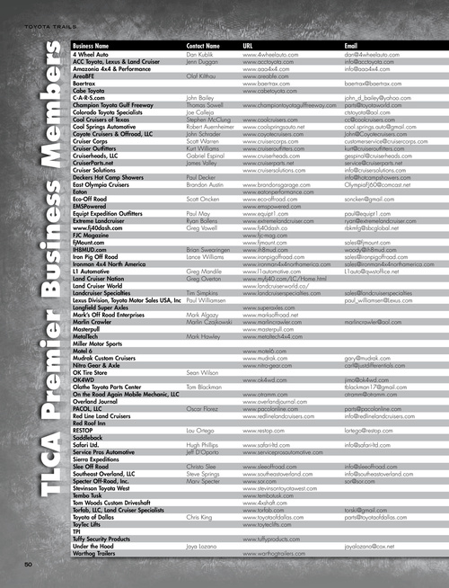 4 Wheel Auto ACC Toyota, Lexus & Land Cruiser Amazonia 4x4 & Performance AreaBFE Baertrax Cabe Toyota C-A-R-S.com Champion Toyota Gulf Freeway Colorado Toyota Specialists Cool Cruisers of Texas Cool Springs Automotive Coyote Cruisers & Offroad, LLC Cruiser Corps Cruiser Outfitters Cruiserheads, LLC CruiserParts.net Cruiser Solutions Deckers Hot Camp Showers East Olympia Cruisers Eaton Eco-Off Road EMSPowered Equipt Expedition Outfitters Extreme Landcruiser www.fj40dash.com FJC Magazine fjMount.com IH8MUD.com Iron Pig Off Road Ironman 4x4 North America L1 Automotive Land Cruiser Nation Land Cruiser World Landcruiser Specialties Lexus Division, Toyota Motor Sales USA, Inc Longfield Super Axles Mark’s Off Road Enterprises Marlin Crawler Masterpull MetalTech Miller Motor Sports Motel 6 Mudrak Custom Cruisers Nitro Gear & Axle OK Tire Store OK4WD Olathe Toyota Parts Center On the Road Again Mobile Mechanic, LLC Overland Journal PACOL, LLC Red Line Land Cruisers Red Roof Inn RESTOP Saddleback Safari Ltd. Service Pros Automotive Sierra Expeditions Slee Off Road Southeast Overland, LLC Specter Off-Road, Inc. Stevinson Toyota West Tembo Tusk Tom Woods Custom Driveshaft Torfab, LLC, Land Cruiser Specialists Toyota of Dallas ToyTec Lifts TPI Tuffy Security Products Under the Hood Warthog Trailers