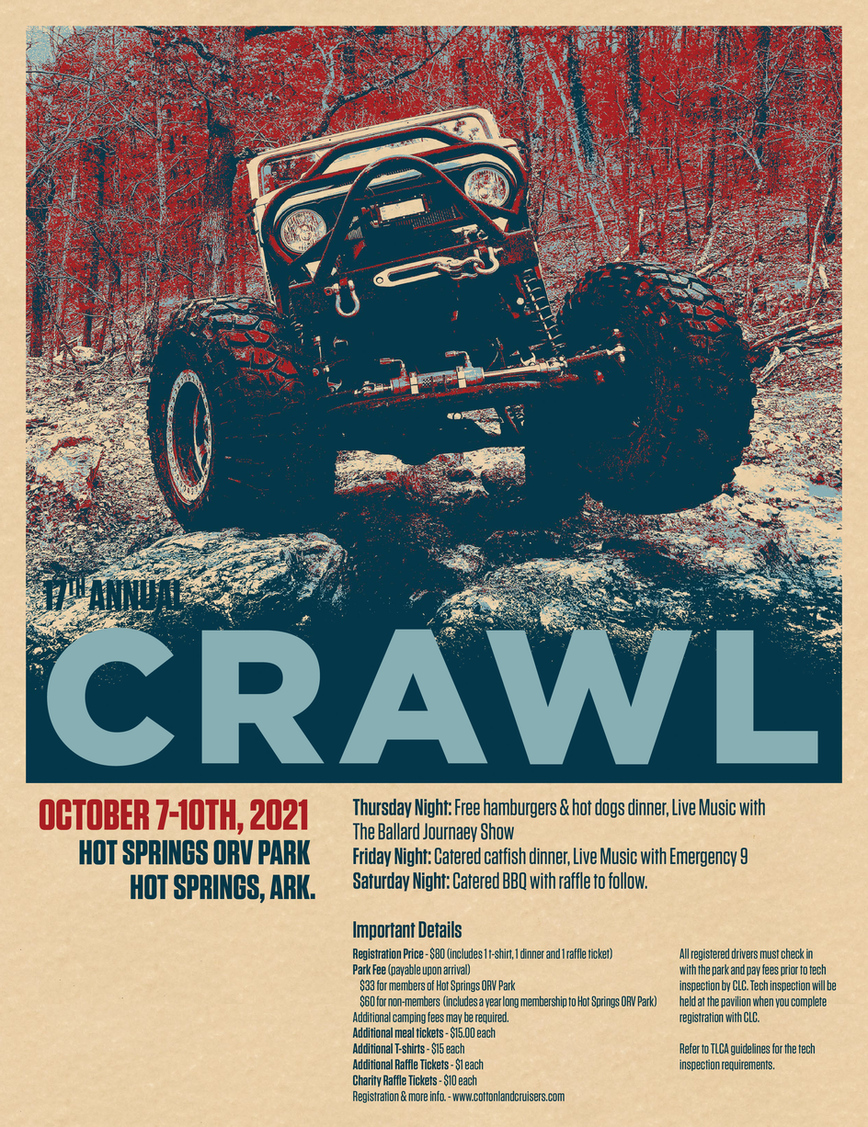 Registration Price - $80 (includes 1 t-shirt, 1 dinner and 1 raffle ticket) Park Fee (payable upon arrival) $33 for members of Hot Springs ORV Park $60 for non-members (includes a year long membership to Hot Springs ORV Park) Additional camping fees may be required. Additional meal tickets - $15.00 each Additional T-shirts - $15 each Additional Raffle Tickets - $1 each Charity Raffle Tickets - $10 each Registration & more info. - www.cottonlandcruisers.com All registered drivers must check in with the park and pay fees prior to tech inspection by CLC. Tech inspection will be held at the pavilion when you complete registration with CLC. Refer to TLCA guidelines for the tech inspection requirements.